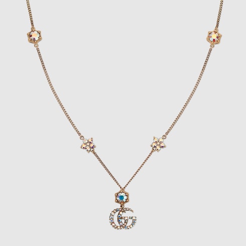 A signature emblem of the House, the initials of Founder Guccio Gucci characterise this necklace. The Double G pendant is set with crystals, and four charms along the antique gold-toned chain add a sparkling and refined touch.