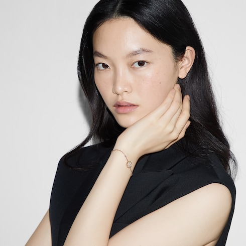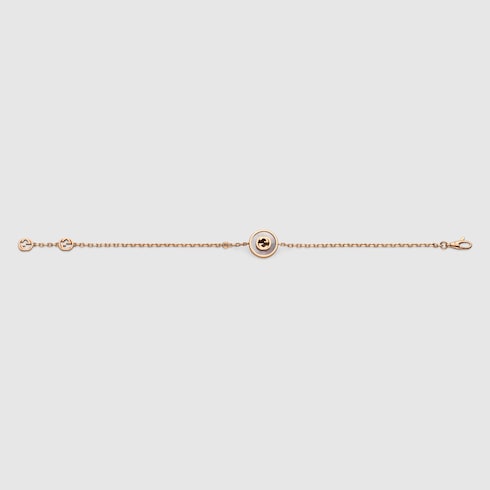 The Interlocking G logo appears in elegant new interpretations for Pre-Fall 2024. Refined rose gold is complemented by iridescent mother-of-pearl stone and a pavé of diamonds. This chain bracelet can be matched with other accessories from the same line.