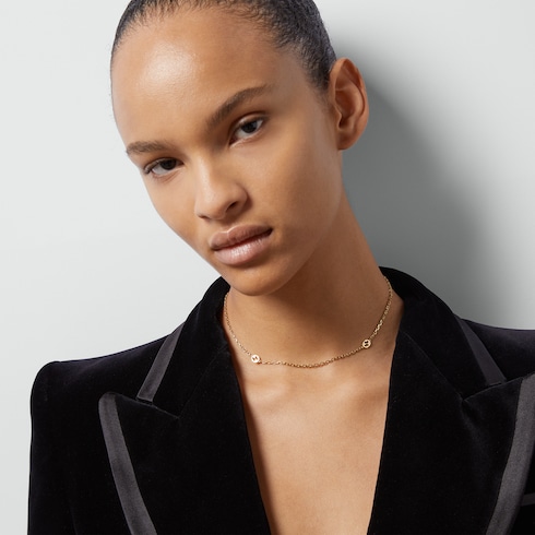 Repurposed as delicate charms, the Interlocking G enriches a yellow gold chain necklace. Gaining notoriety in the 1960s, the emblematic logo is representative of founder Guccio Gucci's initials and has since been reintroduced in a variety of forms and interpretations.