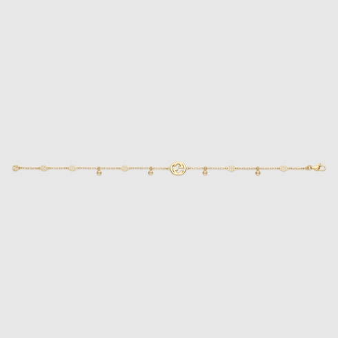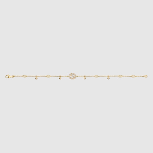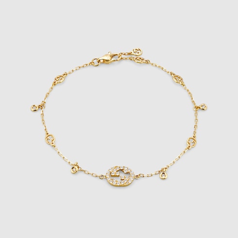 The Gucci Interlocking jewellery collection takes a cue from the geometric logo, resulting in this design. Sparkling with Interlocking G details and set with diamonds, the 18k yellow gold bracelet is ideal for everyday wear.