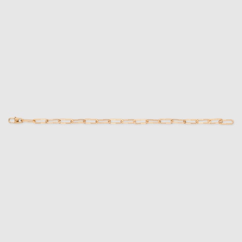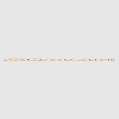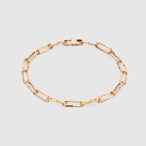 Set with baguette and trilliant-cut diamonds in rose or white gold on bands and hoop earrings, in faceted yellow gold, or a mix of white and rose gold on rings and hoop earrings, all the pieces from the Gucci Link to Love collection offer multiple styling possibilities. This bracelet is crafted from rose gold.