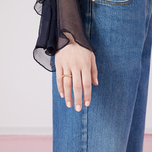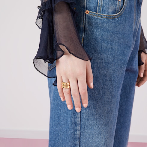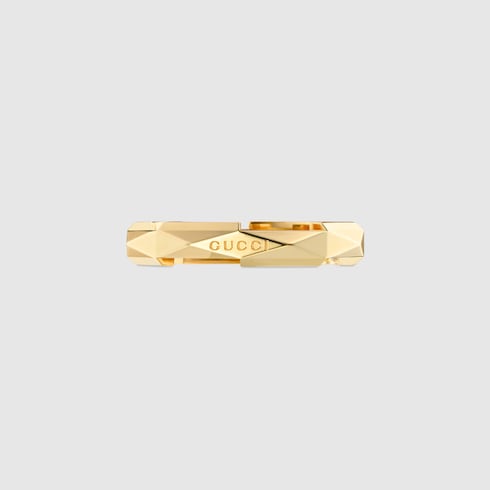 The Gucci Link to Love collection is an exploration of modern romance characterizing new symbols of love. The collection combines different gold tones and a mix of finishes blending the lines between masculine and feminine. Each piece is meant to inspire individualized ways to wear them with stackable and layered features. This 18k yellow gold studded ring has a stackable mechanism.
