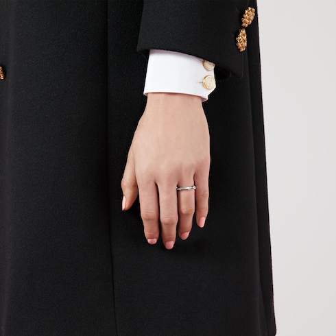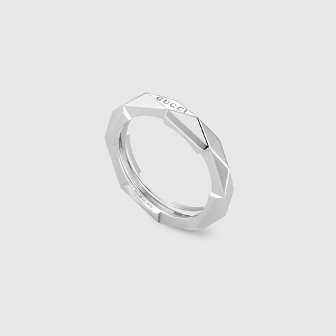 The Gucci Link to Love collection is an exploration of modern romance characterizing new symbols of love. The collection combines different gold tones and a mix of finishes blending the lines between masculine and feminine. Each piece is meant to inspire individualized ways to wear them with stackable and layered features. This 18k white gold studded ring has a stackable mechanism.