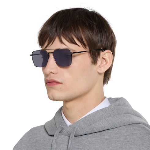The Pre-Fall 2025 eyewear collection successfully combines the coveted silhouettes of bygone decades with a contemporary logo feel. Here, this dark ruthenium-toned metal frame pairs with an Interlocking G and engraved Gucci logo.