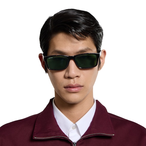 The Pre-Fall 2025 eyewear collection presents sleek silhouettes with the signature Web stripe at the temples. These rectangular frame sunglasses are stated in dark tortoiseshell injection with a Web detail and engraved Gucci logo detail.