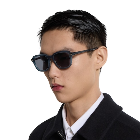 The Pre-Fall 2025 eyewear collection successfully combines the coveted silhouettes of bygone decades with a contemporary logo feel. Here, this transparent blue grey acetate frame pairs with an Interlocking G and engraved Gucci logo.