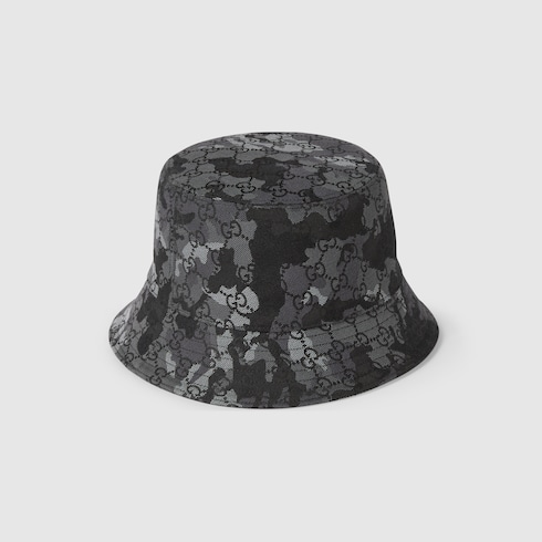 The men's soft accessories collection introduces dynamic shapes in grey and black camouflage print GG canvas. This bucket hat is presented in a camouflage GG marbled canvas jacquard and completed with a cotton lining