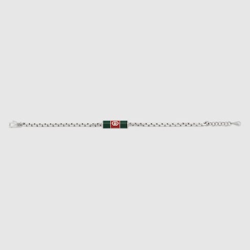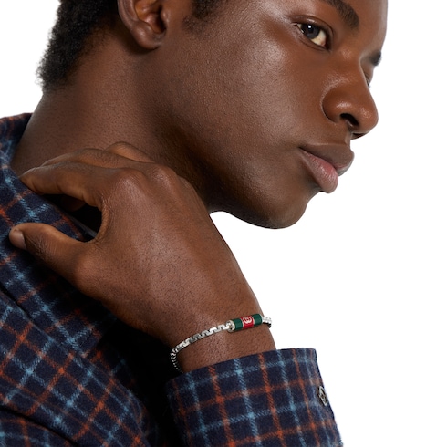The House's silver jewelry collection continues to reinterpret emblematic motifs in sumptuous materials, intricate craftsmanship, and fresh hues, such as this bracelet with a cylindrical Web detail.