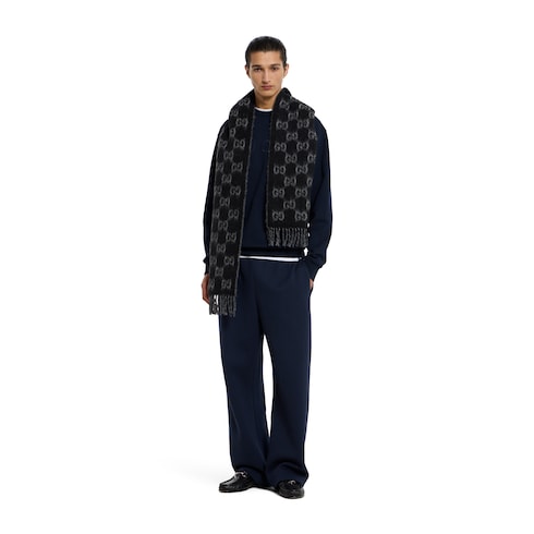 The House's silk accessories collection continues to reinterpret emblematic motifs, from the GG, Web, Flora, bamboo, Horsebit and equestrian inspirations, in sumptuous materials, intricate craftsmanship, and fresh hues. This scarf is stated in a GG alpaca wool and enriched with a fringe trim.