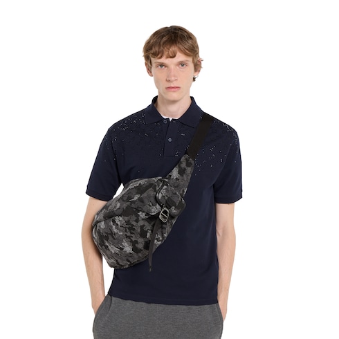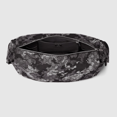 The men's bags collection introduces dynamic shapes in grey and black camouflage print GG canvas, with lightweight construction, ergonomic functionality, and utilitarian details, such as the innovative magnetic buckle. This crossbody bag is presented in a camouflage marbled GG canvas with a black leather trim.