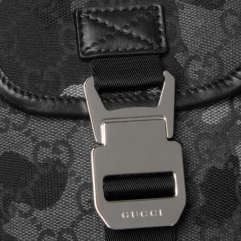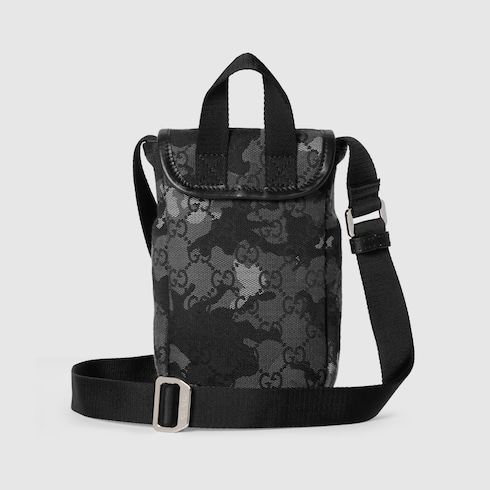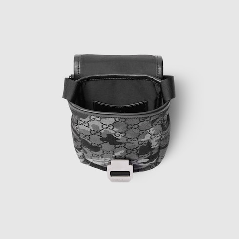 The men's small leather goods collection introduces dynamic shapes in grey and black camouflage print GG canvas, with lightweight construction, ergonomic funtionality, and utilitarian details, such as the innovative magnetic buckle. This mini bag is presented in marbled GG canvas with a black leather trim.
