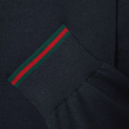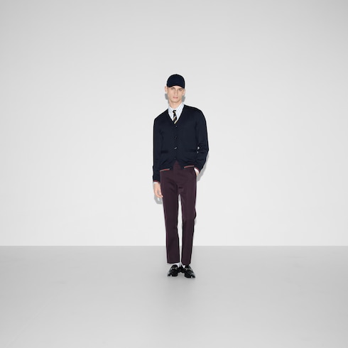 Classics such as soft knitwear and polo shirts throughout the Cruise 2025 collection stand out with subtle details that elevate everyday looks. This V-neck cardigan has been crafted from a fine wool knit and reveals a green and red Web trim.