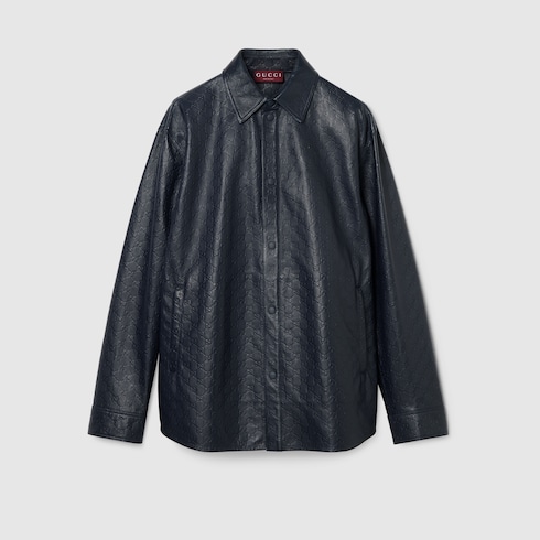 Pre-Fall 2025 pieces in muted black, grey and green tones spotlight delicate floral embroideries, embossed logos, and more craftsmanship details. Crafted from navy embossed GG leather and nylon, this shirt is completed with tonal Gucci metal snap buttons.