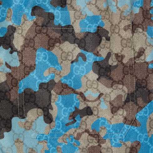 The concept of matching sets is reinterpreted through the lens of modern tailoring. Sartorial lines refine uniform-inspired silhouettes, creating complete looks. Crafted from polyester technical poplin, these swim shorts are defined by an allover GG marbled print.
