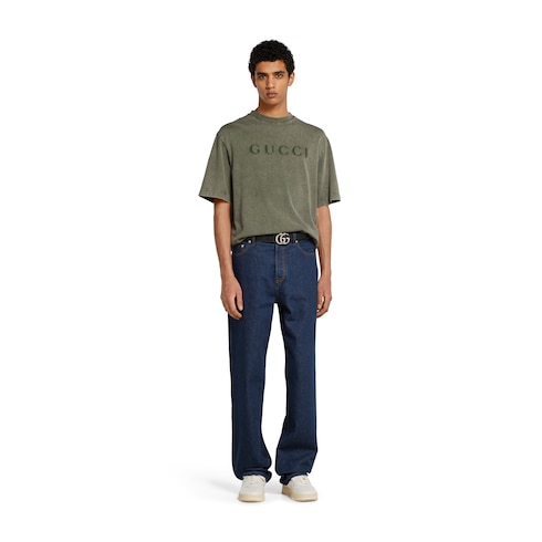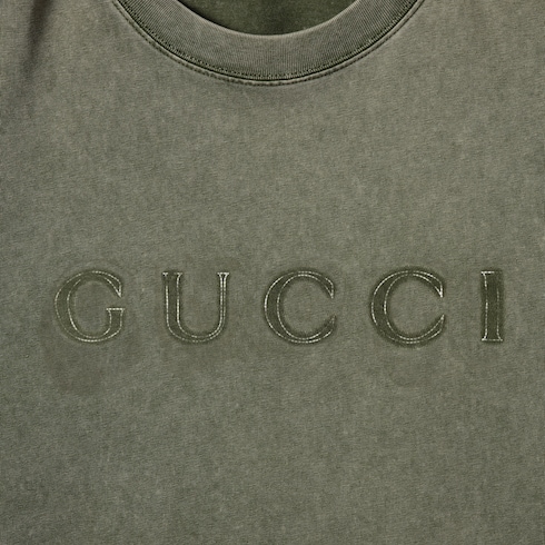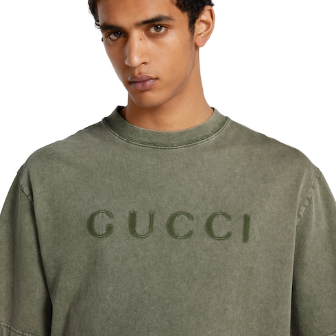 Pre-Fall 2025 pieces in muted black, grey and green tones spotlight delicate floral embroideries, embossed logos, and more craftsmanship details. Crafted from forest green heavy cotton jersey, this T-shirt is defined by a Gucci logo print.