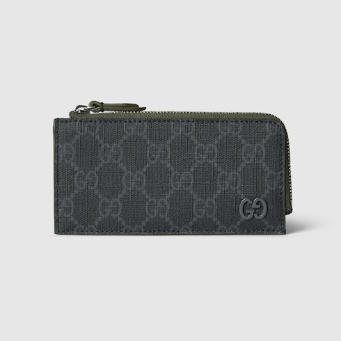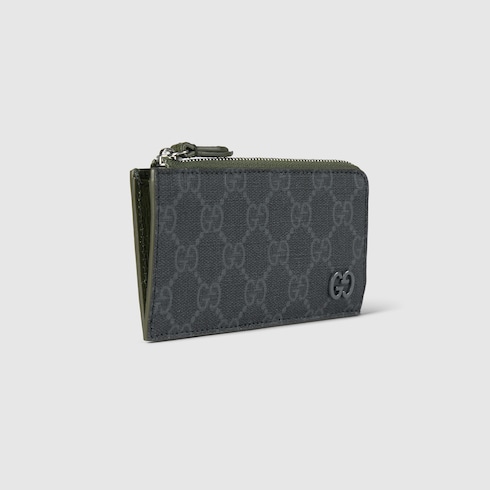 Slim and compact small leather goods from the latest collections highlight new colourful shades sporting the GG logo with a bicolour design. This zip card case with five slots appears in a black GG Supreme canvas, complete with a smooth dark green leather trim.