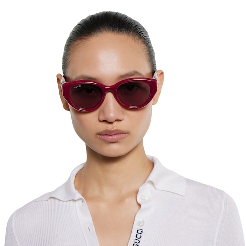 The Pre-Fall 2025 eyewear collection successfully combines the coveted silhouettes of bygone decades with a contemporary logo feel. Here, this Gucci Rosso Ancora red injection frame pairs with a Double G detail.