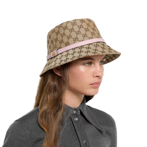 In the Fall Winter 2025 collection, the signature GG motif returns in soft shades. Crafted from cotton canvas, this bucket hat showcases the Original GG canvas with a pink leather trim.