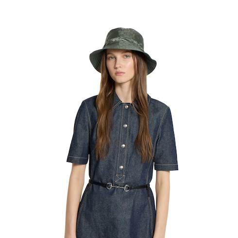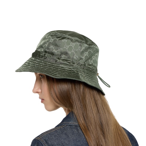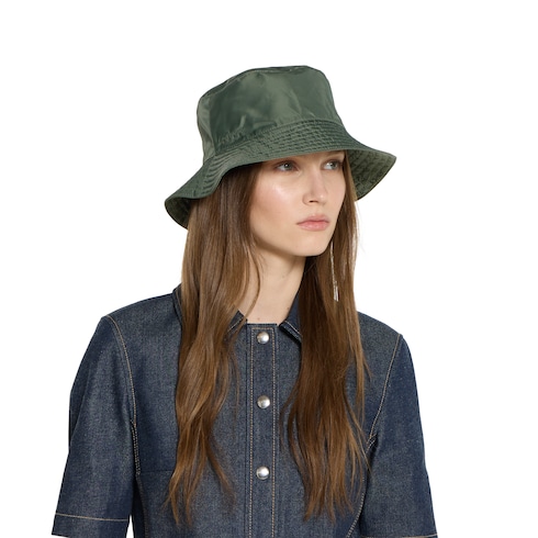 The Pre-Fall 2025 collection presents a vibrant range of soft accessories from hairbands to reversible bucket hats. This reversible bucket hat is presented in GG nylon on the one side, with plain nylon on the other, further enriched with a Gucci embroidery. The packable design makes it a versatile addition to every look.