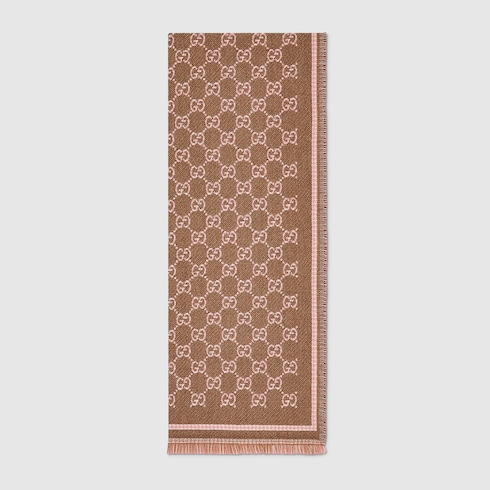 The Pre-Fall 2025 silk and soft accessories' collection animate House codes through sophisticated trimmings, logo patches and subtle embroideries. This scarf is presented in GG wool with a fringe trim.
