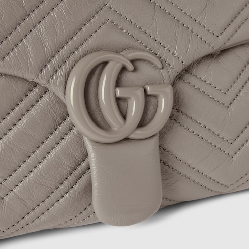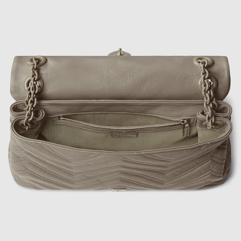 In the Fall Winter 2025 collection, the GG Marmont, a signature collection of the House, features the emblematic Double G, a faceted chain strap, and a soft, structured silhouette. This style is crafted from soft lightweight matelassé chevron leather and comes with a tonal enameled hardware and chain.