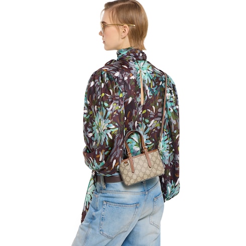 The GG Emblem collection introduces contemporary silhouettes in the women's small leathergoods, ideal for carrying daily essentials. This beige and brown mini bag is crafted from the GG Monogram coated fabric. Featuring a brown leather trim, the design comes with a detachable and adjustable leather shoulder strap.