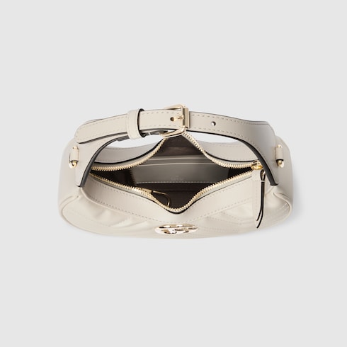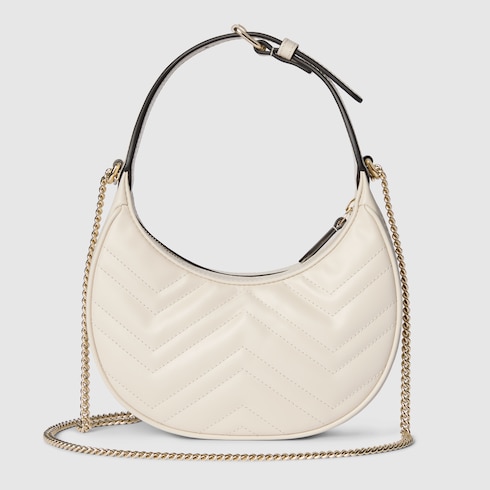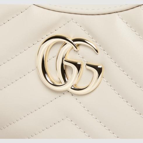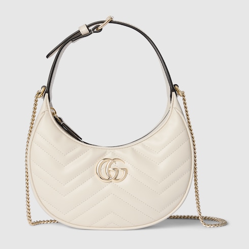 With a crescent silhouette and textured white leather, this small bag has a defined retro feel. Each collection is a journey through different decades and eras, combining vintage elements with archival codes or contemporary details to create new designs that exist outside of space and time. The small accessory reflects this fascination with the past, a concept that runs throughout the world of GG Marmont.