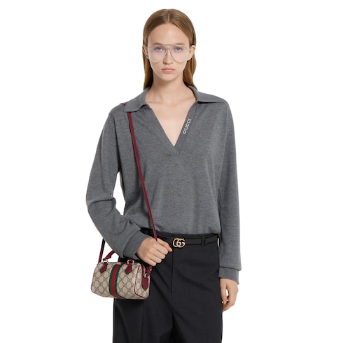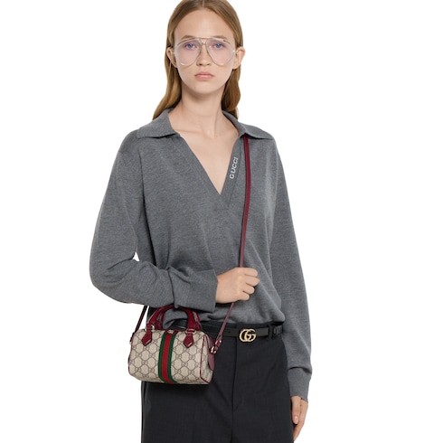 The Ophidia collection evokes the House’s heritage with the signature Web stripe and Double G emblem in light gold-toned finish. The styles are crafted from soft GG Monogram coated fabric, featuring green cotton lining inside. The boston bag design is presented in this mini style.
