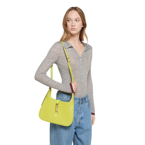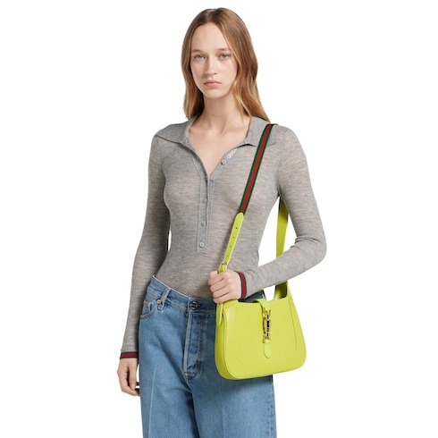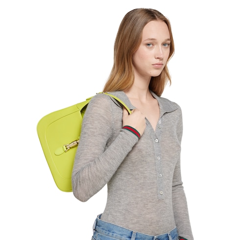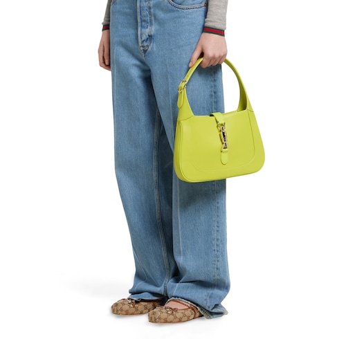 In the Pre-Fall 2025 collection, this Gucci Jackie 1961 shoulder bag is crafted from bright green leather, complete with light gold-toned piston closure and two shoulder straps.