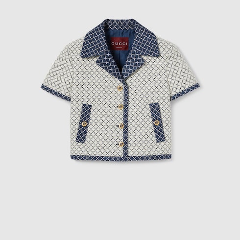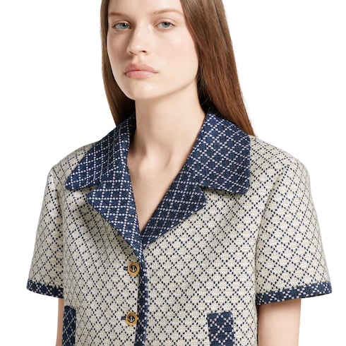 Coats, jackets, and dresses blend discreet elegance with refined details in the Pre-Fall 2025 collection. Created from a diamond cotton bouclé with a bon-ton feel, this jacket showcases refined Gucci anchor buttons.
