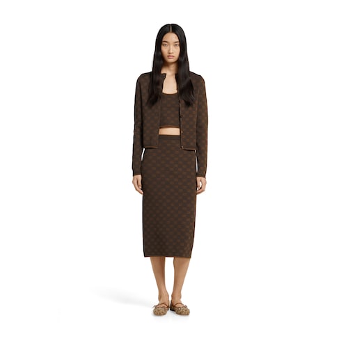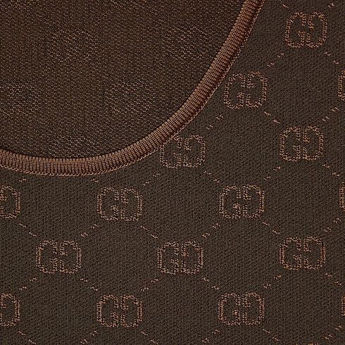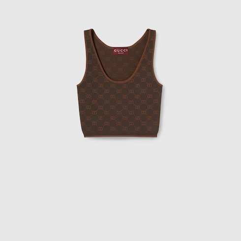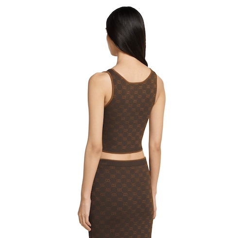 The House's heritage motifs are presented on a backdrop of sophisticated textures, from off-duty denim to lightweight materials, for the Pre-Fall 2025 collection. The GG motif appears here as a jacquard detail atop a sporty tank top in stretch viscose.