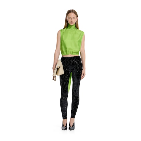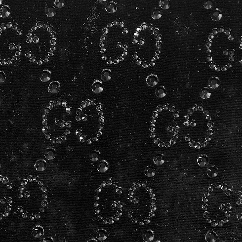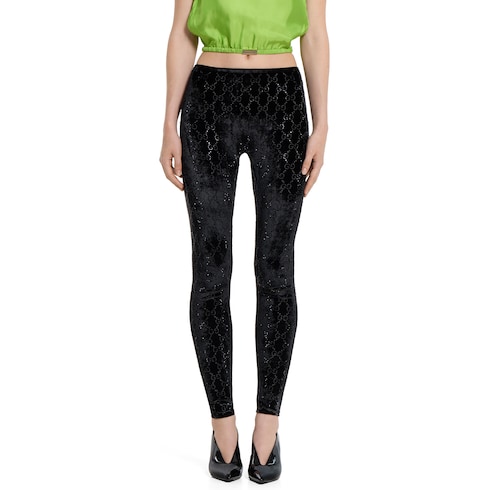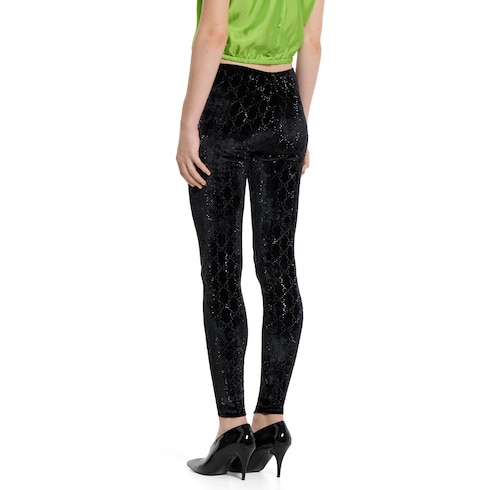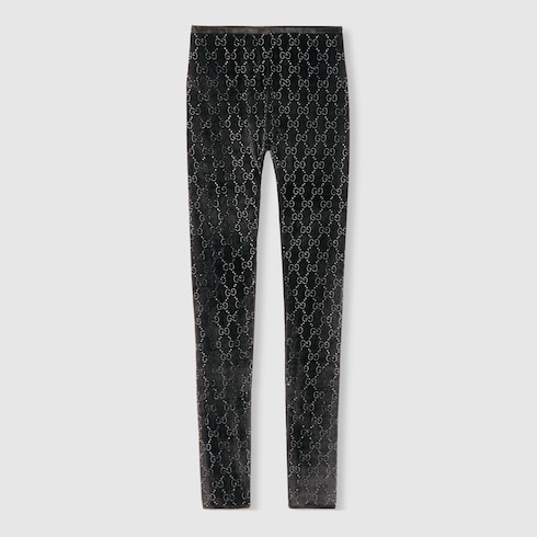 In the Fall Winter 2025 collection, stretch chenille leggings are reimagined with a luminous touch. The style is embellished with allover GG crystal embroidery, combining signature codes with a contemporary touch.