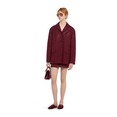 Gradient-effect crystal embroidery creates a sparkling contrast with the texture of emblematic fabrics of the House. Crafted from Gucci Rosso Ancora red GG canvas, this skirt is enriched with gradient GG crystals.