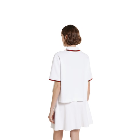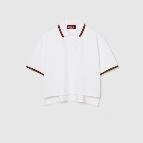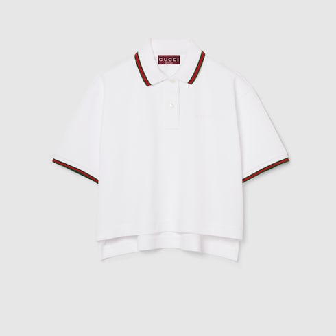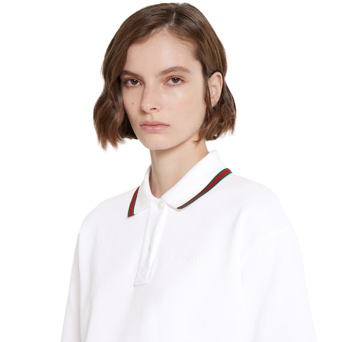 The House continues to explore its connection to the world of tennis that began in the 1970s. Signature pieces focus on heritage details like the Web stripe, as well as innovative materials. This polo shirt features a green and red Web trim and Gucci embroidery.