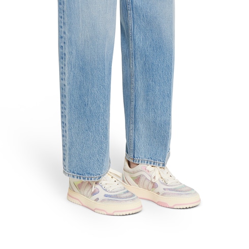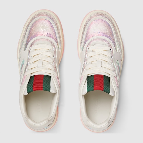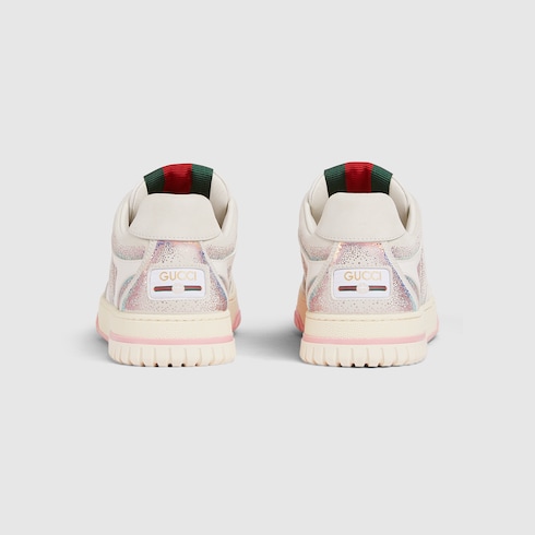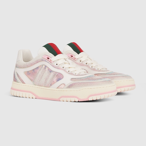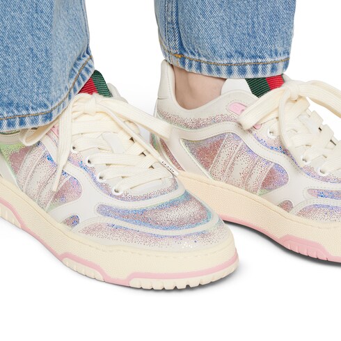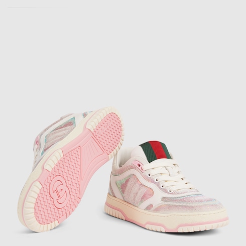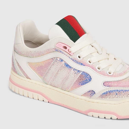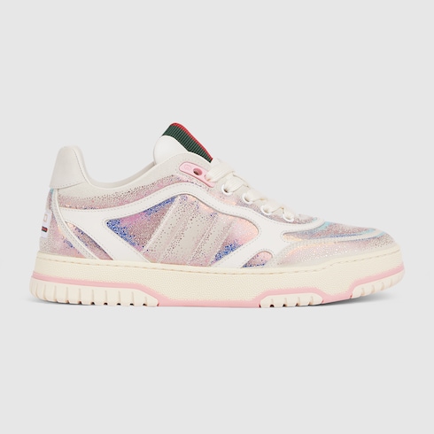 The Re-Web sees Gucci’s heritage stripes as a bold statement detail on a contemporary silhouette. This pair is crafted from glitter leather. Defined by multiple details, this new sneaker takes center stage with the bold green and red Web tongue.