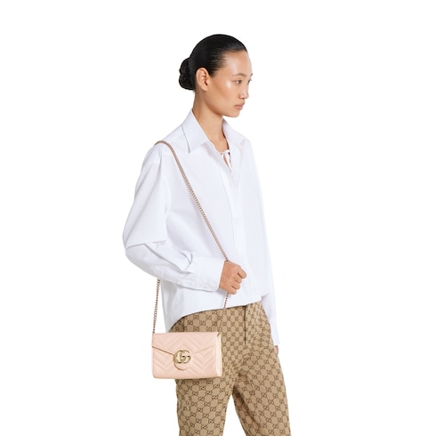 The GG Marmont wallet on chain is presented in matelassé leather. The style is completed with the line's signature Double G hardware.