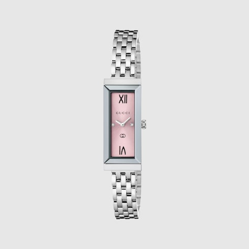 คอลเล็กชั่น G-Frame มีความโดดเด่นที่ตัวเรือนทรงสี่เหลี่ยมผืนผ้าอันหรูหรา พร้อมผสมผสานรายละเอียดอันเป็นมรดกกับความงามแบบร่วมสมัย แอคเซสเซอรี่ชิ้นนี้มาพร้อมตัวเรือนสแตนเลสสตีล ตกแต่งเพิ่มเติมด้วยหน้าปัดสีชมพูประดับเพชร