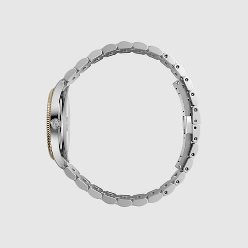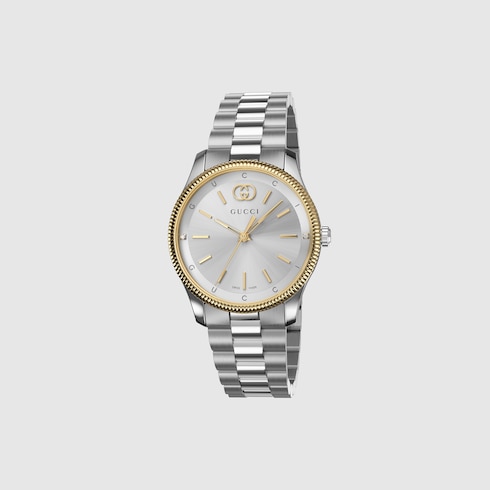 - ตัวเรือนสแตนเลสสตีลขนาด 29 มม. พร้อมขอบเคลือบทอง, หน้าปัดสีเงินประดับเพชรพร้อม Interlocking G และตัวอักษร Gucci, สายนาฬิกาสแตนเลสสตีล