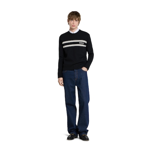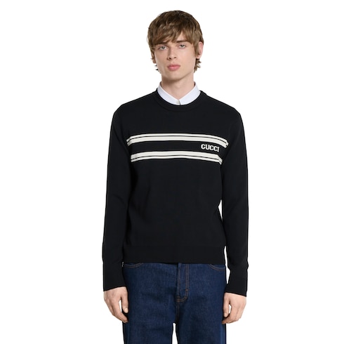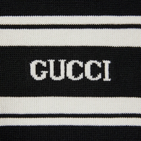 คอลเล็กชั่น Pre-Fall 2025 เผยความโดดเด่นให้กับรูปทรงสำคัญพร้อมกับรายละเอียดสัญลักษณ์ที่สวมใส่ได้ตั้งแต่วันจรดค่ำ เสื้อสเวตเตอร์ตัวนี้รังสรรค์ด้วยผ้าฝ้ายไหมถักสีดำและสีขาว ตกแต่งด้วยอินทาร์เซีย Gucci อันโดดเด่น