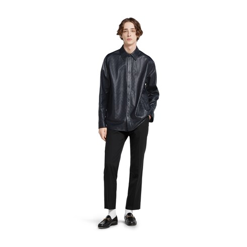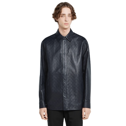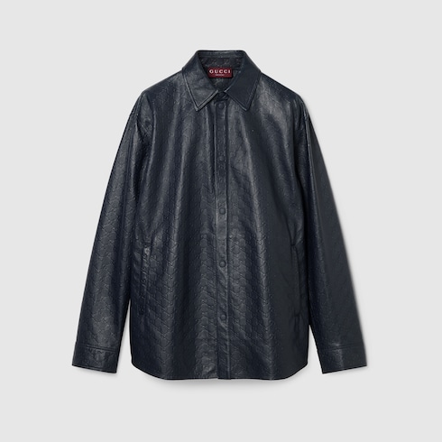 ไอเท็มสำหรับคอลเล็กชั่น Pre-Fall 2025 ในโทนสีดำ สีเทา และสีเขียวเอิร์ธโทนโดดเด่นด้วยลายปักรูปดอกไม้ สัญลักษณ์ลายนูน และรายละเอียดงานฝีมือต่างๆ เสื้อเชิ้ตตัวนี้รังสรรค์ด้วยหนัง GG ลายนูนและผ้าไนลอนสีกรมท่า พร้อมกระดุมแบบสแน็ปโลหะ Gucci โทนสีเดียวกัน