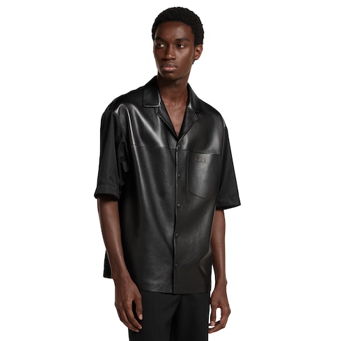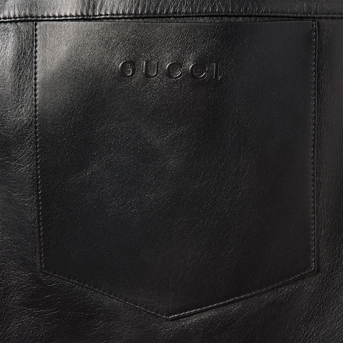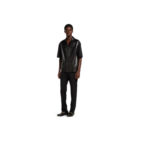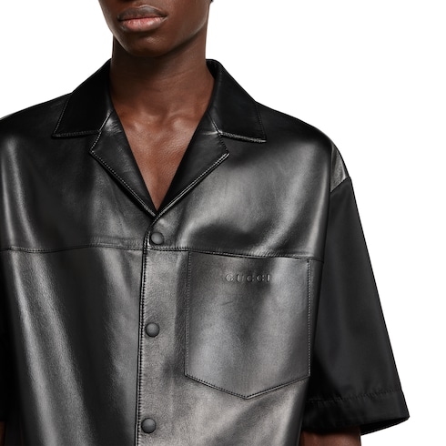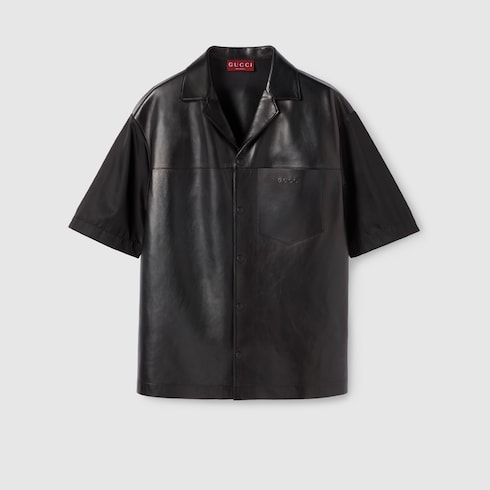 ไอเท็มสำหรับคอลเล็กชั่น Pre-Fall 2025 ในโทนสีดำ สีเทา และสีเขียวเอิร์ธโทนโดดเด่นด้วยลายปักรูปดอกไม้ สัญลักษณ์ลายนูน และรายละเอียดงานฝีมือต่างๆ เสื้อโปโลเชิ้ตตัวนี้รังสรรค์ด้วยหนังนัปป้าแบบนิ่มพร้อมผ้าไนลอนตกแต่งด้วยสัญลักษณ์ Gucci ลายนูน