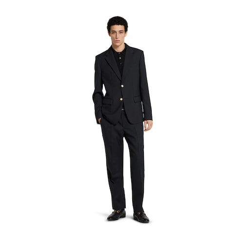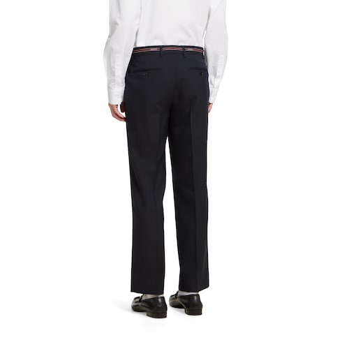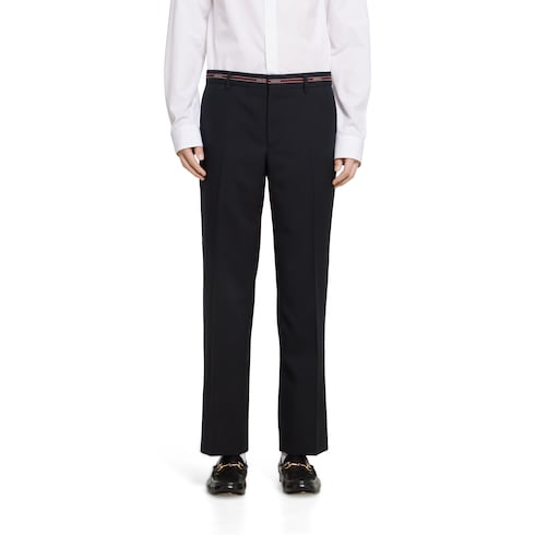 ไอเท็มใส่ได้ทุกวันได้รับการยกระดับด้วยริมแดง Gucci หรือลายพิมพ์สัญลักษณ์วินเทจ Gucci เพื่อเผยซิตี้ลุค กางเกงตัวนี้ที่รังสรรค์จากผ้าวูลสีน้ำเงินเข้มมาพร้อมรายละเอียดริมแดง Gucci สีแดงตรงเอวเพื่อช่วยเพิ่มสัมผัสอันหรูหรา