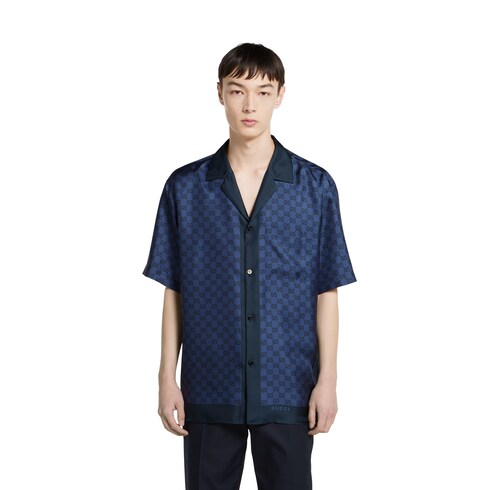 สัญลักษณ์ประจำแบรนด์ของ Gucci ยังคงพัฒนาอย่างต่อเนื่องในฤดูกาลใหม่ เสื้อเชิ้ตทรงพอดีตัวตัวนี้รังสรรค์ด้วยผ้าซิลค์ทวิลสีน้ำเงิน พร้อมด้วยลายพิมพ์ GG ทั้งตัว