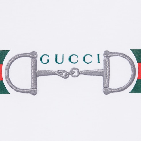 คอลเล็กชั่น Cruise 2026 สำหรับผู้ชายเป็นการเดินทางผ่านมรดกและความทันสมัยที่ฝังรากอยู่ในคลังผลงานของ Gucci เสื้อยืดผ้าฝ้ายเจอร์ซีย์เนื้อหนาปานกลางตัวนี้โดดเด่นด้วยลายพิมพ์แถบ Web และลายปัก Gucci Horsebit