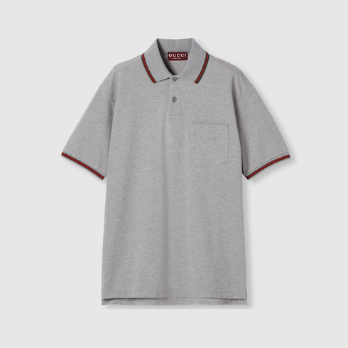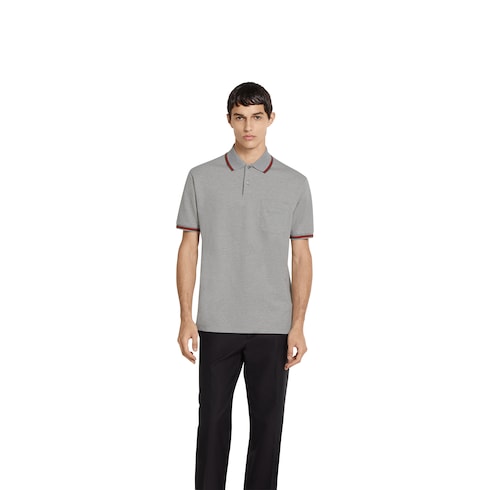 เฉดสีแห่งฤดูใบไม้ร่วงเสริมความโดดเด่นของซีเล็กชั่นไอเท็มเสื้อผ้าที่จับคู่กับรายละเอียดอันเป็นมรดกของแบรนด์ เสื้อโปโลเชิ้ตทรงพอดีตัวตัวนี้นำเสนอในรูปแบบผ้าฝ้ายปีเก้แบบยืดสีเทาเมลานจ์และโดดเด่นด้วยลายปักสัญลักษณ์