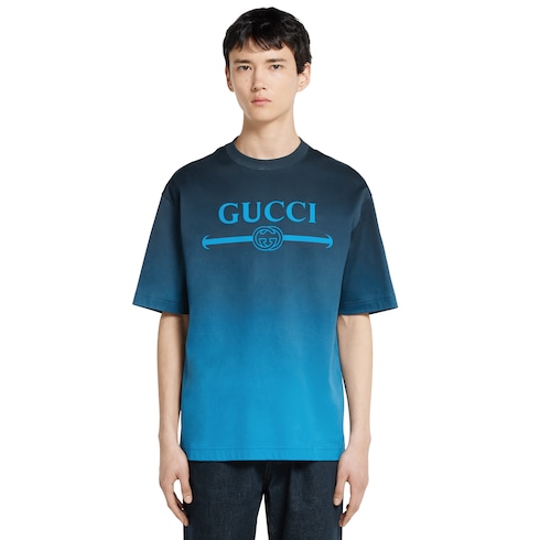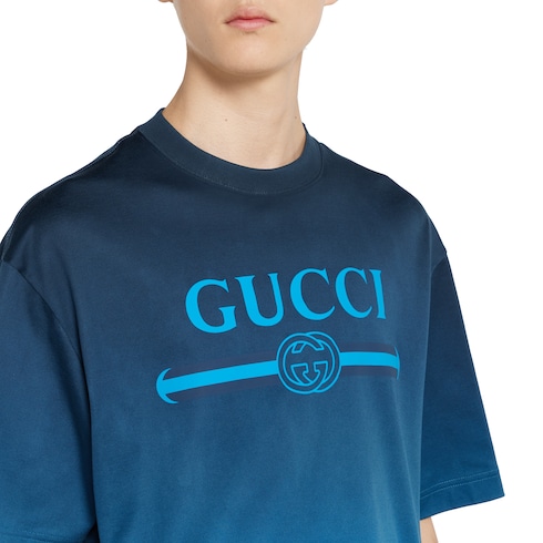 สีสันไล่สีได้รับการรังสรรค์ขึ้นอย่างพิถีพิถันเพื่อเผยเท็กเจอร์ของวัสดุและลวดลาย GG อันเป็นที่รู้จัก เสื้อยืดตัวนี้รังสรรค์ด้วยผ้าคอตตอนเจอร์ซีย์เทคนิคคอลย์สีน้ำเงินไล่สี พร้อมโดดเด่นด้วยสัญลักษณ์ Gucci พร้อมลายพิมพ์ Web Interlocking G