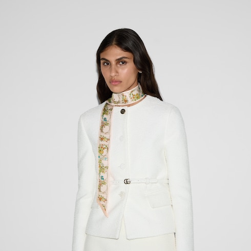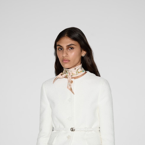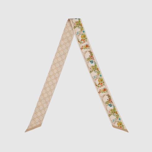 ลายพิมพ์ Flora แบบดั้งเดิมได้รับการปรับโฉมใหม่สำหรับคอลเล็กชั่น Cruise 2025 ลวดลายดอกไม้เผยโฉมบนซีเล็กชั่นแอคเซสเซอรี่ผ้าไหมและซอฟต์แอคเซสเซอรี่ในเฉดสีพาสเทลเพื่อเพิ่มความรู้สึกโรแมนติกให้กับไอเท็ม ริบบิ้นชิ้นนี้รังสรรค์จากผ้าไหม และโดดเด่นด้วยลายพิมพ์ Gucci ดอกไม้ และสัตว์ในสวนทั่วทั้งริบบิ้น