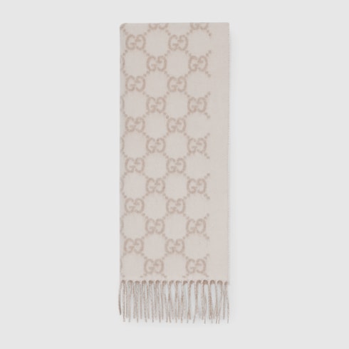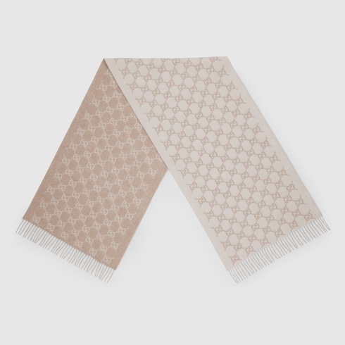 ชื่อย่อของ Guccio Gucci ผู้ก่อตั้งแบรนด์ วางสลับกันทั่วทั้งซีเล็กชั่นแอคเซสเซอรี่ผ้าซิลค์ ผ้าพันคอผืนนี้นำเสนอในรูปแบบผ้าแคชเมียร์ GG พร้อมด้วยขอบแต่งพู่ระบายโทนสีเดียวกัน