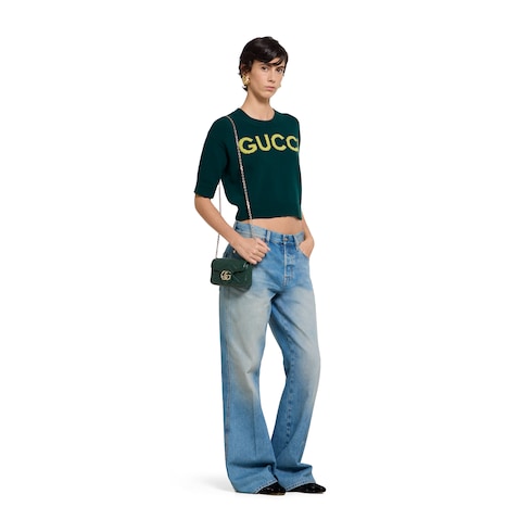 GG Marmont เปิดตัวดีไซน์มินิในเฉดสีที่แปลกใหม่ เช่น กระเป๋าสะพายมินิหนัง Matelassé เชฟรอนสีเขียวใบนี้ ซึ่งมาพร้อมกับฮาร์ดแวร์ Double G แต่งโทนสีทองอ่อน