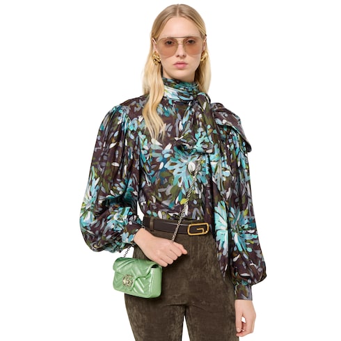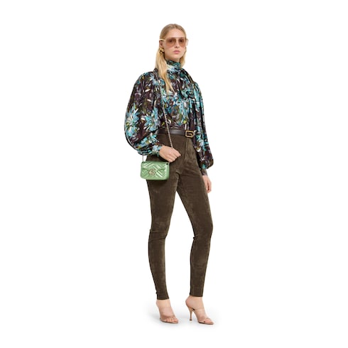 คอลเล็กชั่น GG Marmont อันเป็นเอกลักษณ์ของแบรนด์นำเสนอด้วยฮาร์ดแวร์ Double G สายโซ่แบบเหลี่ยมมุม และโครงสร้างที่นุ่มนวล นำเสนอในหนังลาเม่สำหรับกระเป๋าสะพายใบนี้